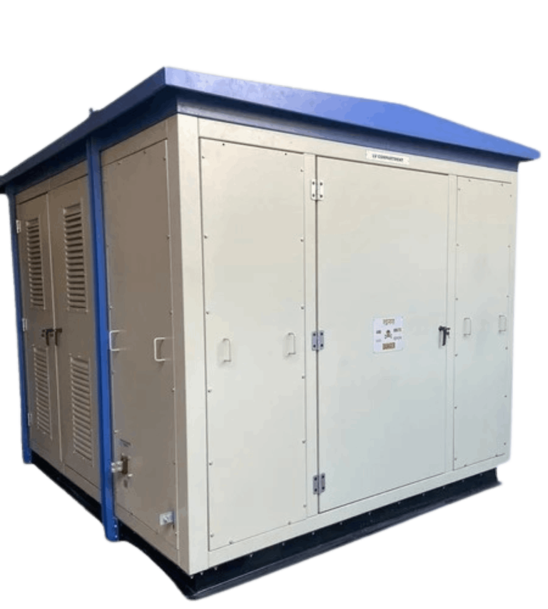 Integrated Components: Includes a step-down transformer, HV switchgear (VCB/RMU), LV distribution panel, and protection devices.